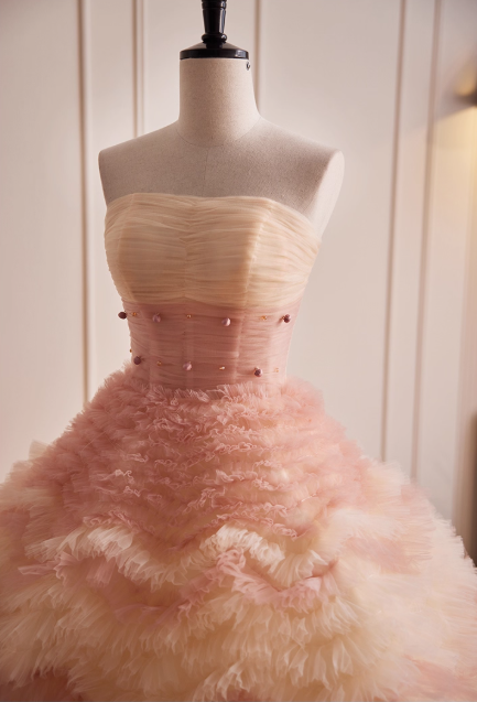 Elegantes, trägerloses Ballkleid aus rosa Ombré-Tüll mit Rüschen für Sweet 16 Quinceañera DP7505