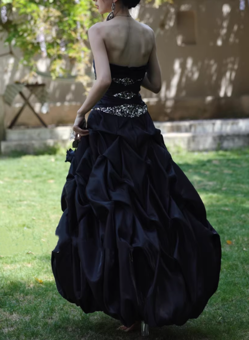 Elegantes schwarzes trägerloses, perlenbesetztes Satin-Ballkleid mit Raffungen für Sweet 15 Quinceañera DP7976