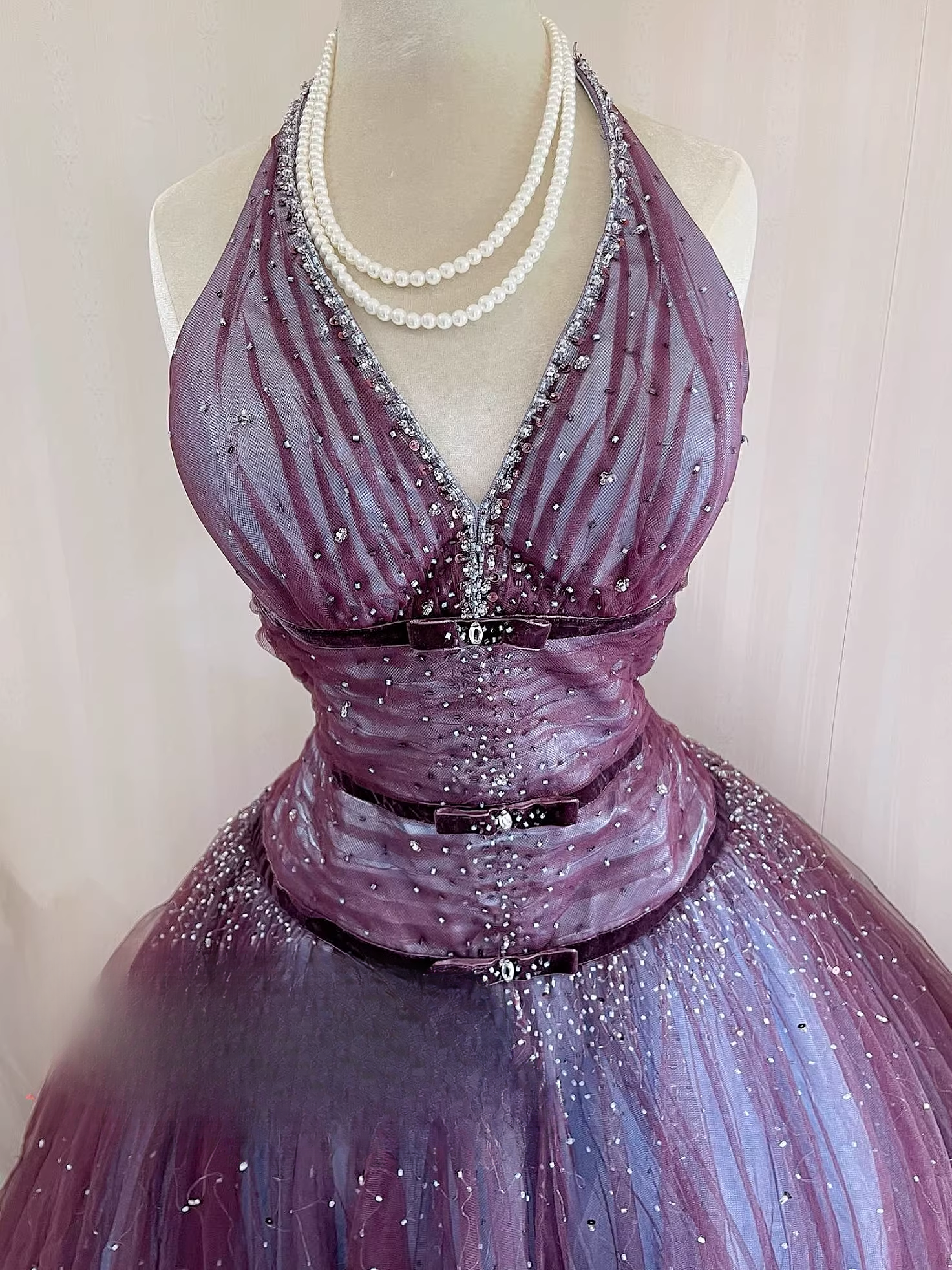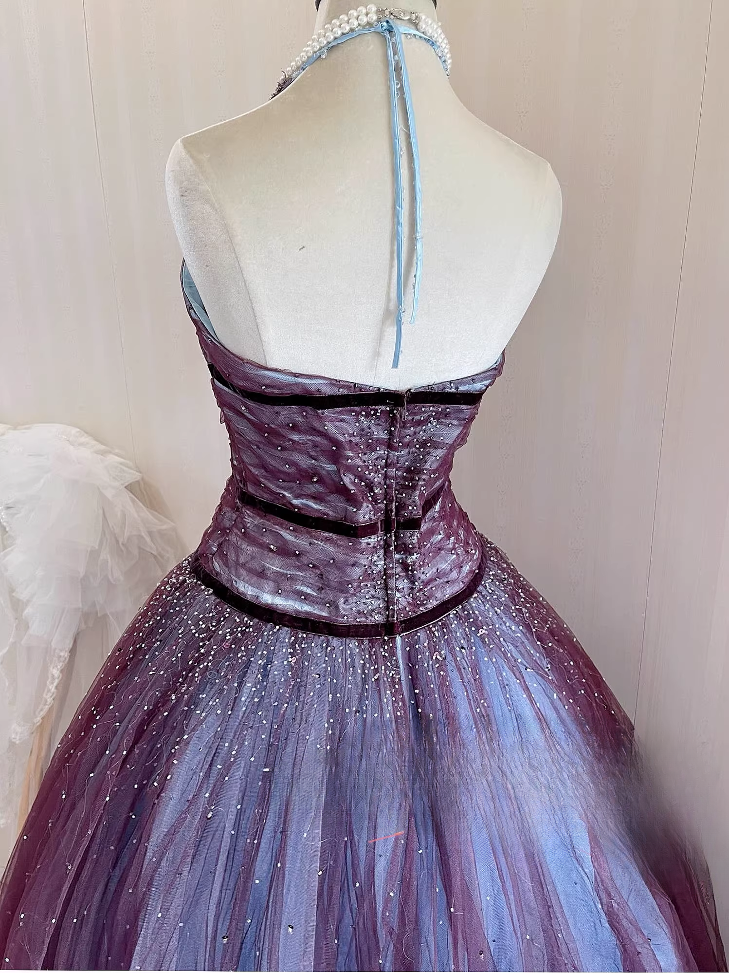 Elegantes lavendelfarbenes Ombré-Ballkleid aus Tüll mit Neckholder und Perlenbesatz für Sweet 16 Quinceañera DP7769