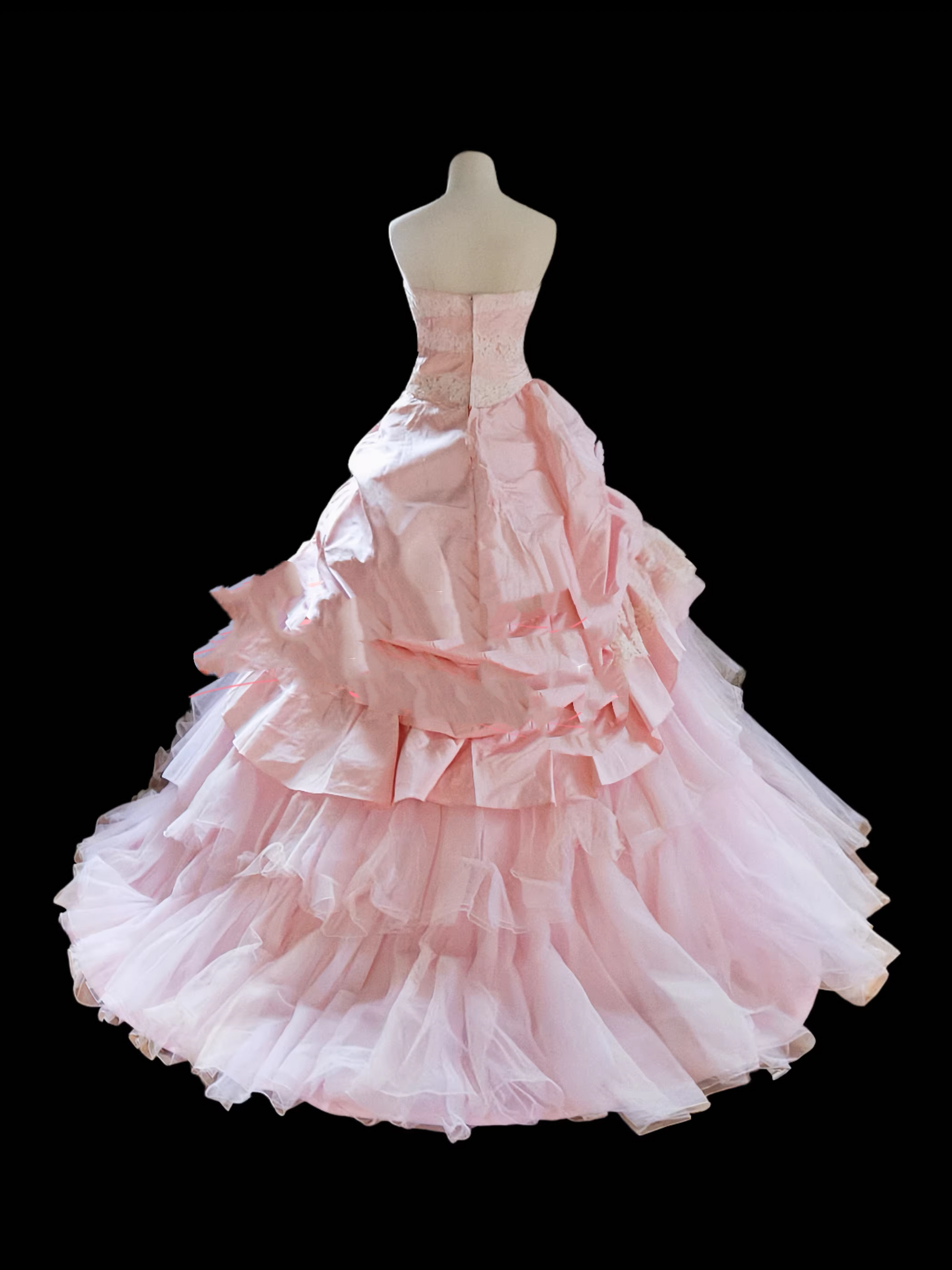 Elegantes, trägerloses, rosafarbenes Ballkleid mit Spitzenapplikationen, Satin- und Tüllbesatz für Sweet 15 Quinceañera DP7772