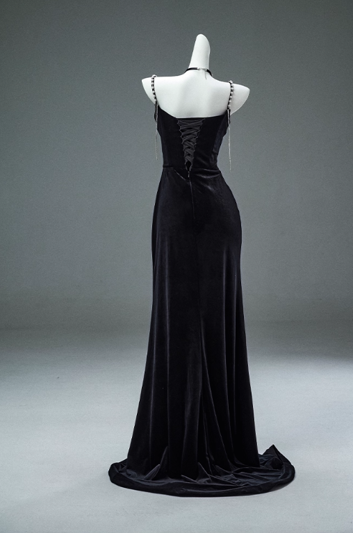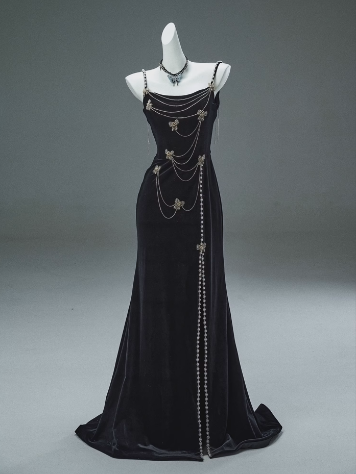 Glamouröses schwarzes Samt-Etuikleid mit Schleife, Kette, Spaghettiträgern und Perlenbesatz DP7461