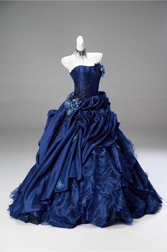 Wunderschönes, trägerloses Ballkleid aus Satin in Königsblau mit 3D-Blumenrüschen und Rüschen für den 16. Geburtstag (Quinceañera) DP7426