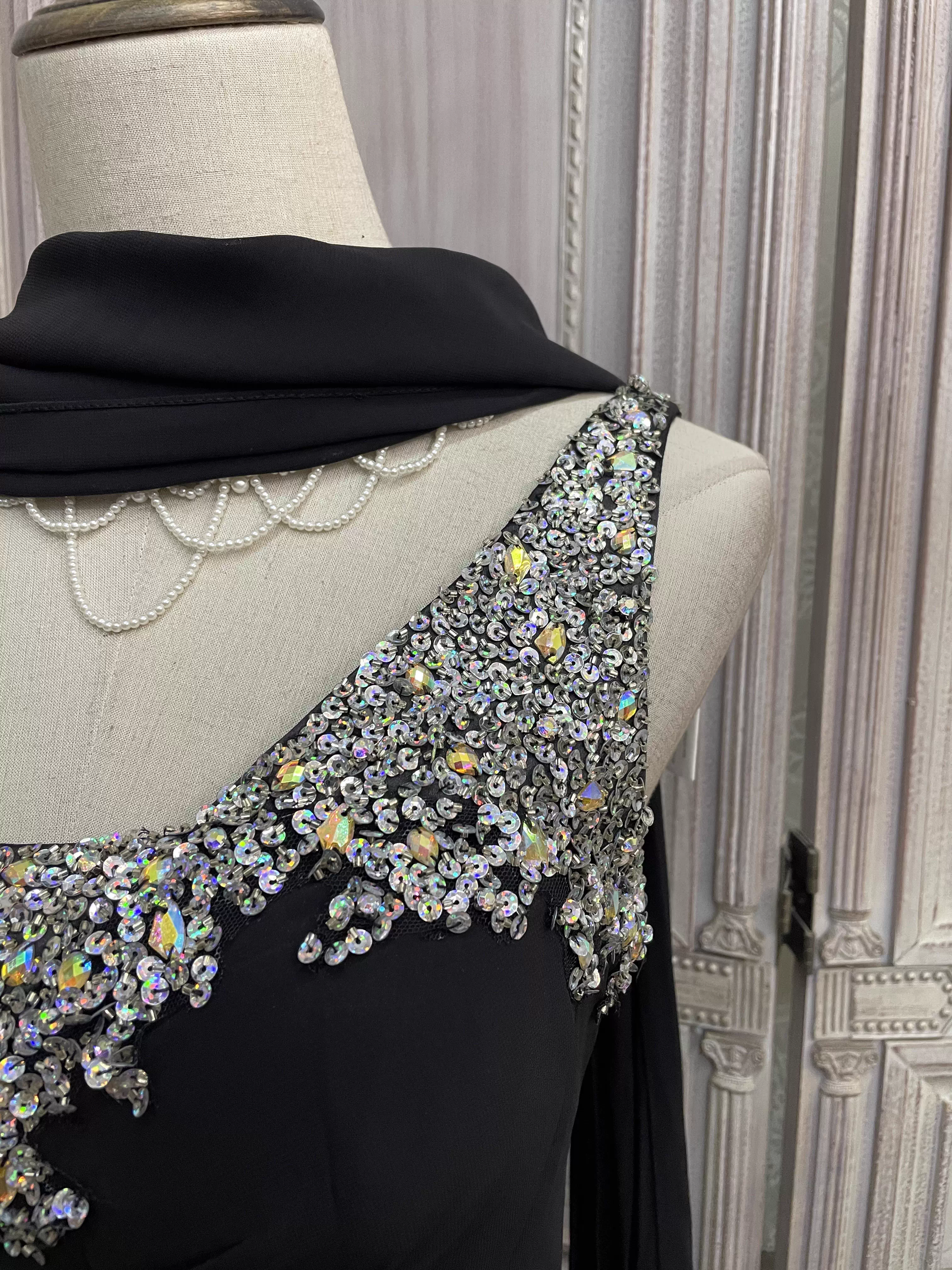 Vintage schwarzes, einseitig schulterfreies Satin-Abendkleid mit Perlenbesatz und Schleppe, formelles Ballkleid DP7598