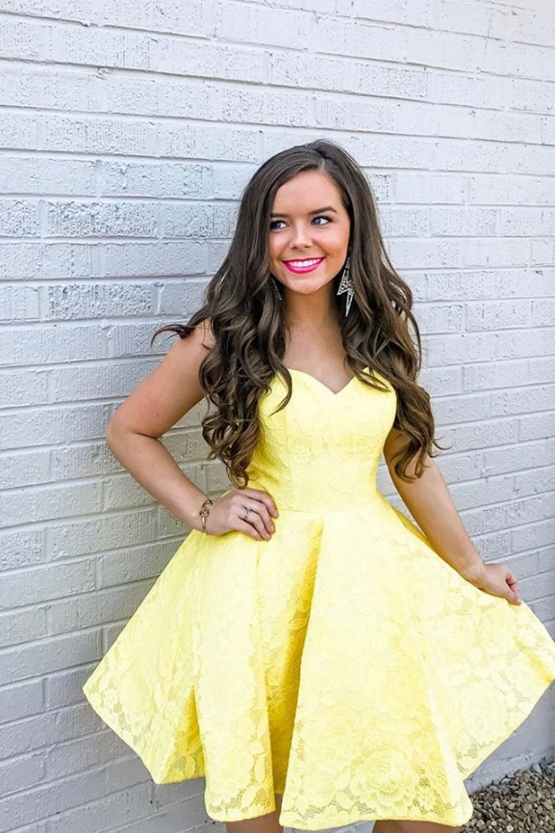 Cute yellow lace short prom dress yellow homecoming dress,DS2350