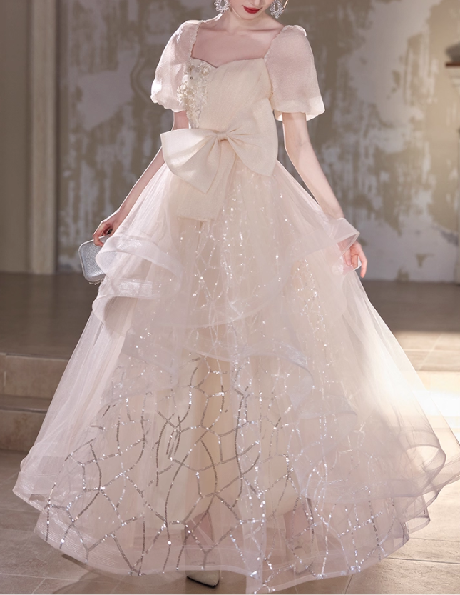 Glamorous Champagne Sequin Tiered Square Neck Puff Sleeves Bow-Accented Formal Prom Dress DP7541