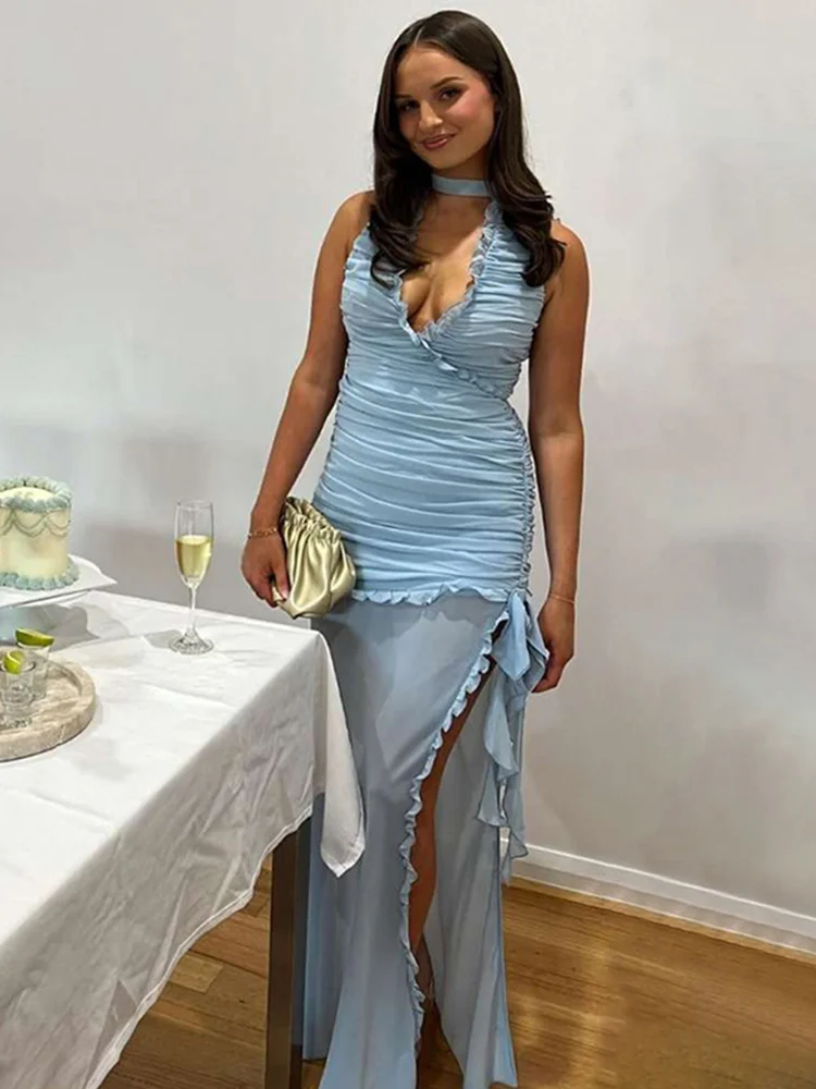 Light Blue V Neck Sheath Chiffon Long Party Dress Wedding Guest Dress, DP4863