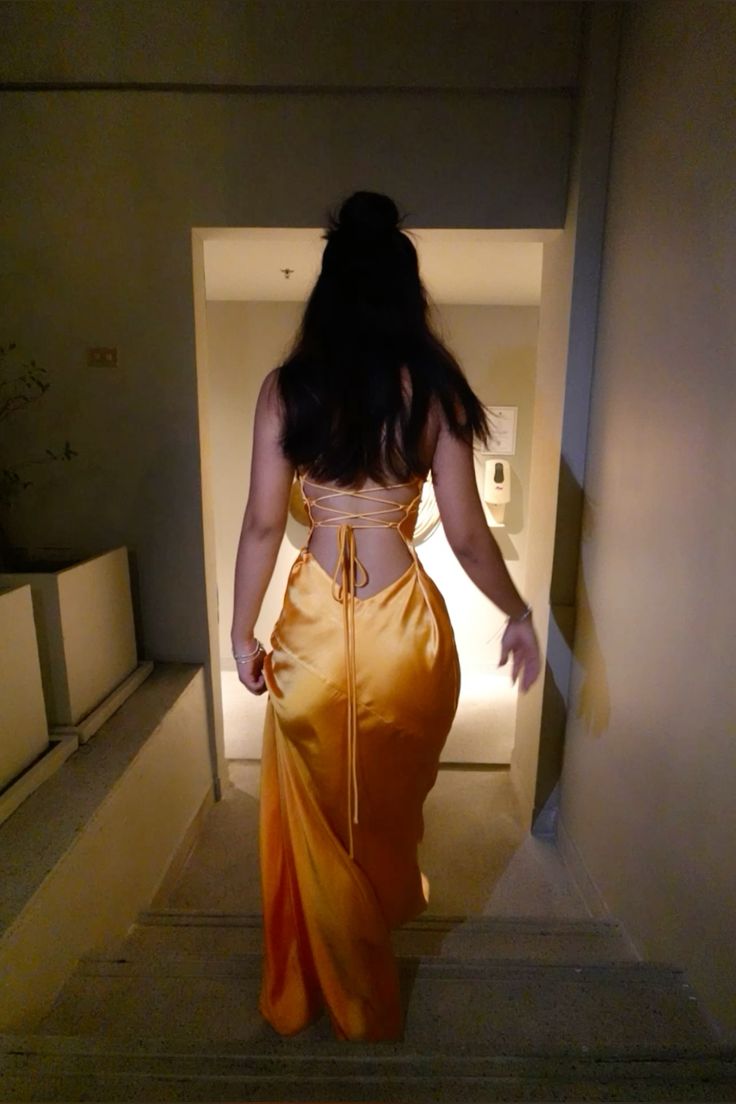 Orange Straps V Neck Sheath Satin Long Party Dress Wedding Guest Dress, DP4766