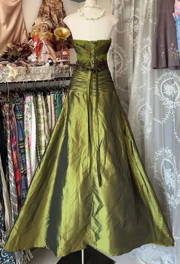 Vintage Olive Green Strapless Prom Dress Beaded Bodice Layered Tulle Evening Gown DP7912