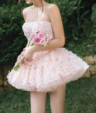Vintage Pink Floral Applique Strapless Ruffled Tulle Homecoming Dress A-Line Mini Party Gown DP7876