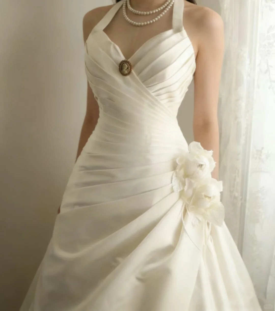 Vintage Cream Satin Halter-Neck Ruched Bodice 3D Flower Wedding Dress DP7642