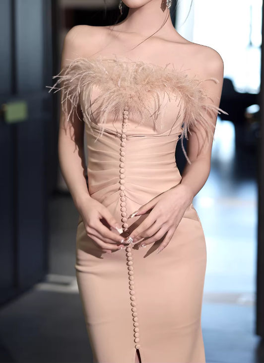 Elegant Mermaid Feather Trim Evening Gown Spaghetti Strap Satin Prom Dress DP7800