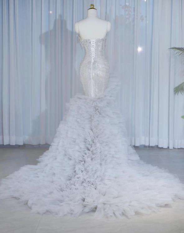 Glamorous Silver Ombre Ruffled Tulle Mermaid Strapless Beaded Formal Evening Gown DP7456