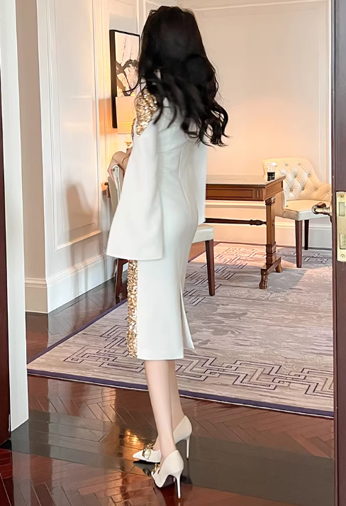 Glamorous White & Gold Sequin Evening Gown Cape-Sleeve Midi Sheath Prom Dress DP7697