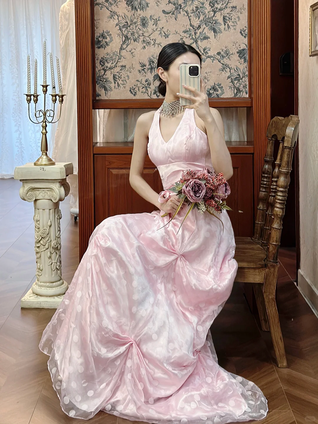 Robe de bal rose à pois, col halter et ceinture, pour Sweet 16 ou Quinceañera DP7945