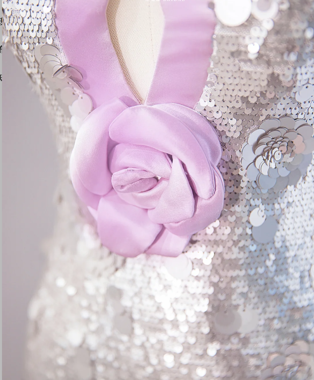Robe de soirée somptueuse DP7443, ornée de sequins argentés, d'un décolleté à volants lavande et d'une rose 3D.