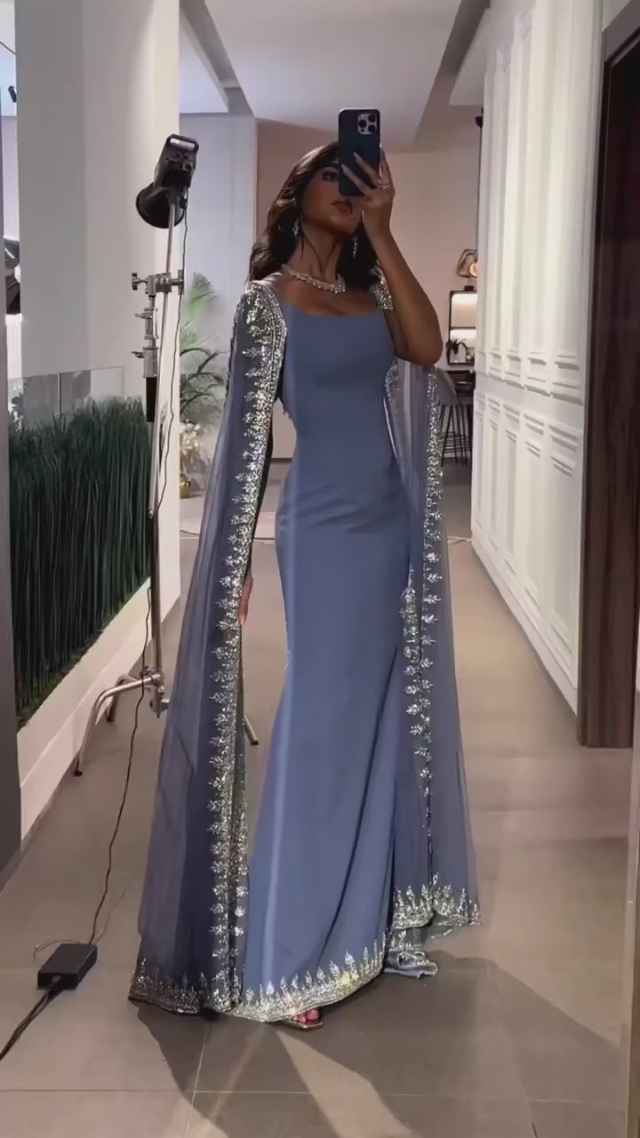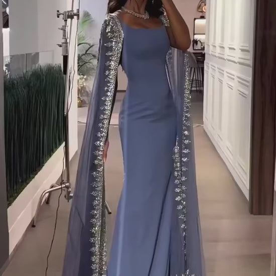 Robe de soirée sirène bleu poussiéreux vintage, robe de bal perlée avec appliques, design cape unique, robe de soirée longue DP500