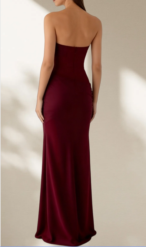 Robe de soirée fourreau vintage bordeaux en satin, sans bretelles, froncée, DP7818