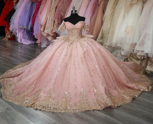 Robe de bal de quinceañera vintage rose à épaules dénudées, en tulle brodé de sequins dorés DP7228