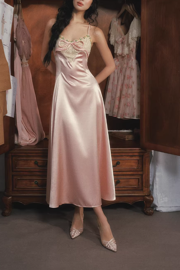 Robe nuisette vintage en satin rose, dentelle appliquée, bretelles spaghetti, robe de soirée DP7996