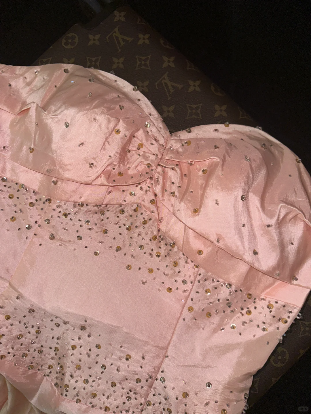 Romantic Blush Satin Sweetheart Ruffled Strapless Beaded Evening Gown DP7297