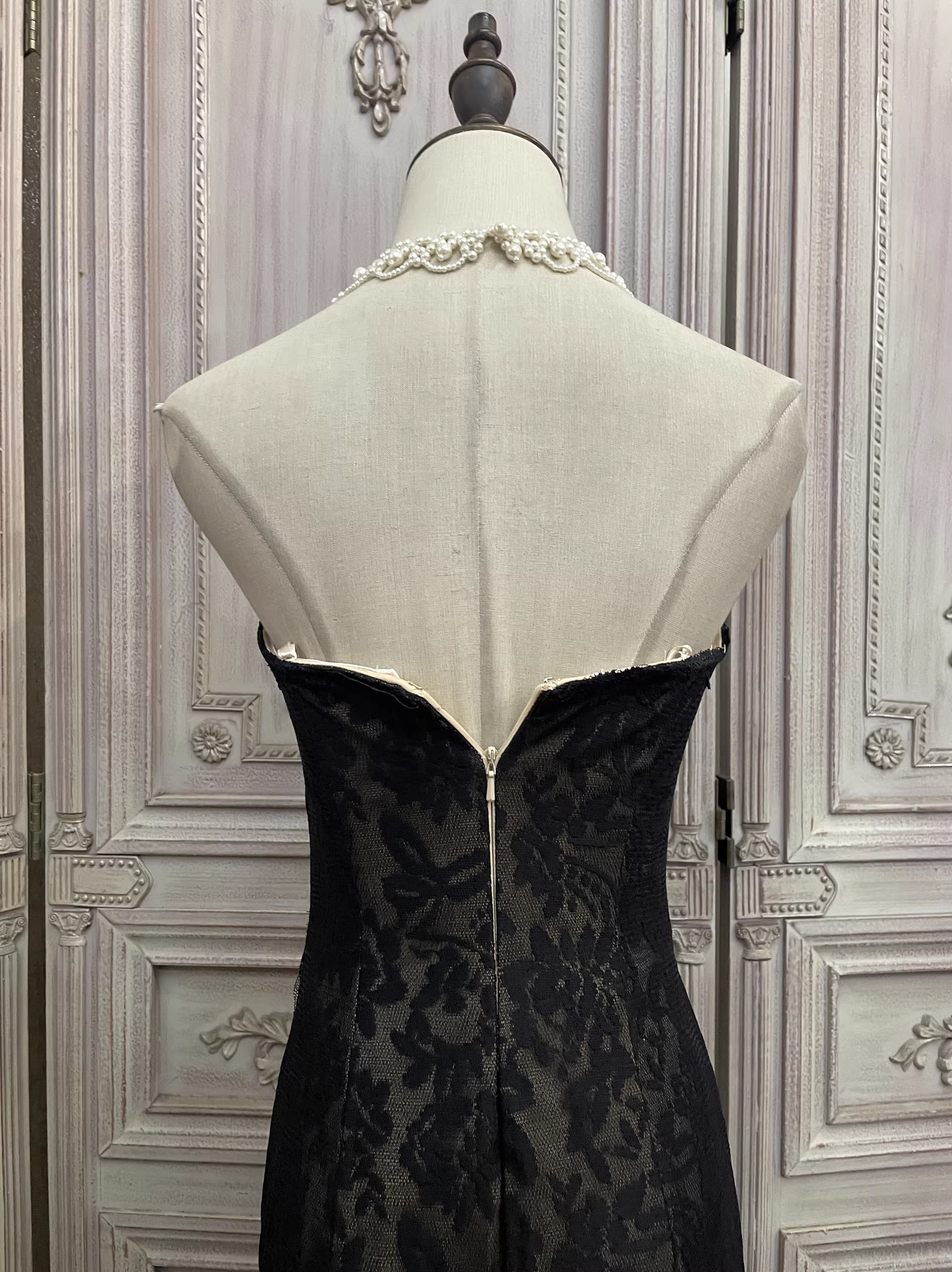 Vintage Black Strapless Mermaid Lace Evening Gown Sheer Floral Embroidery Formal Prom Dress DP7593
