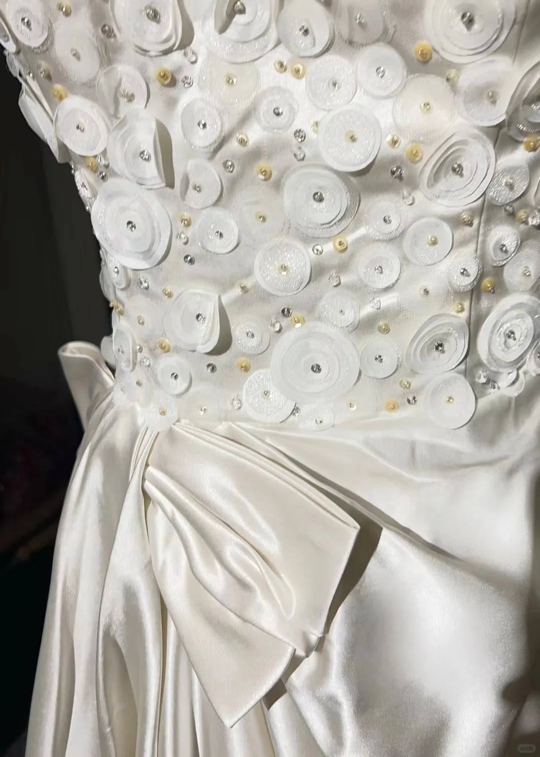 Vintage-Inspired Ivory Satin Strapless Lace Applique & Bow for Timeless Wedding Dress DP7283