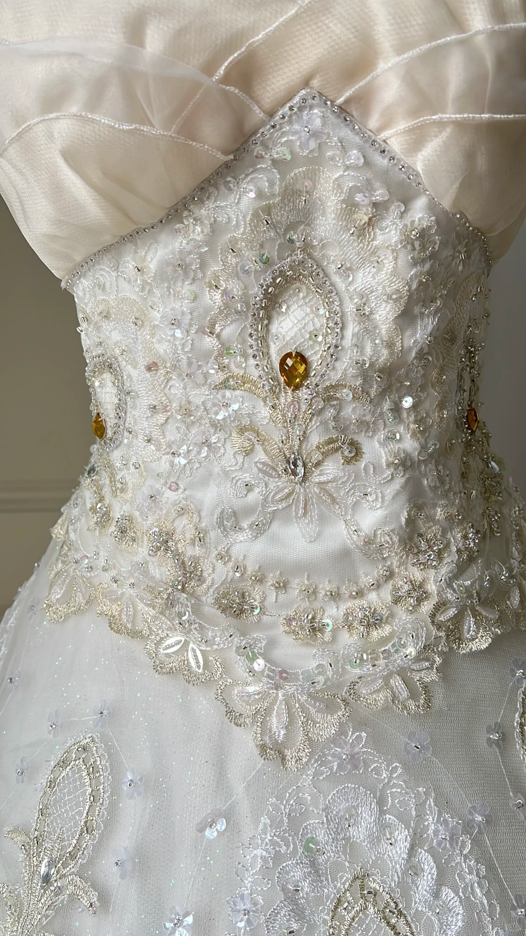 Vintage-Inspired Ivory Tiered Tulle Sweetheart Strapless Sequined Rhinestone Wedding Dress DP7303
